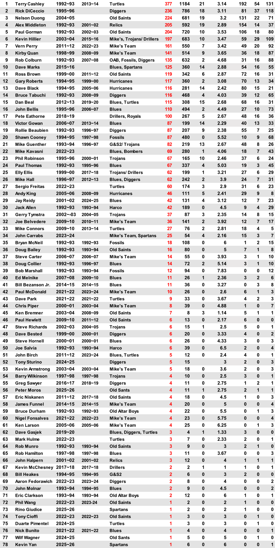 Since 1992-93. Regular season only.  Games played for other teams are not counted. You can sort the entire list by selecting one of the headers. First Season Final Season Home Page ALL  TIME  GOALTENDING  CAREER  STATS L